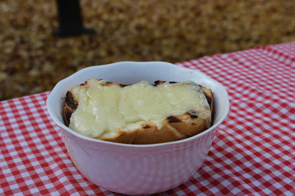 I waited until the soup was at a slow boil, then removed a few of the coals. I let the soup simmer for about 15 minutes, then started on the last item: Toasted French Bread topped with melted Swiss cheese!