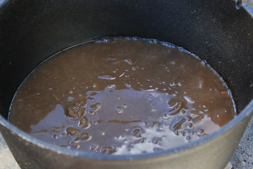 While the steaks are grilling, and with my coals ready, I got my Dutch oven heating up. When it was warm, I added, slowly, two cans of French onion concentrated soup and 4 cups of water. I let that start to simmer.