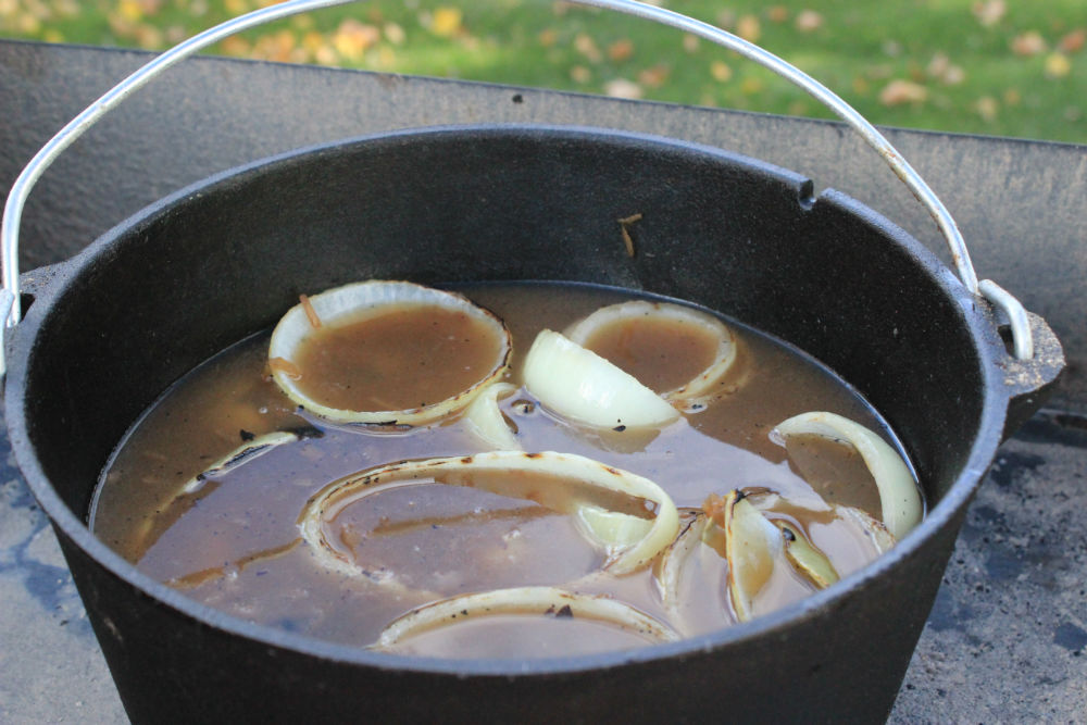 - While steaks are cooking, put coals underneath the Dutch oven and add the 2 cans of French onion soup and water to the Dutch oven. Put lid on, with coals on lid and allow to start heating up.