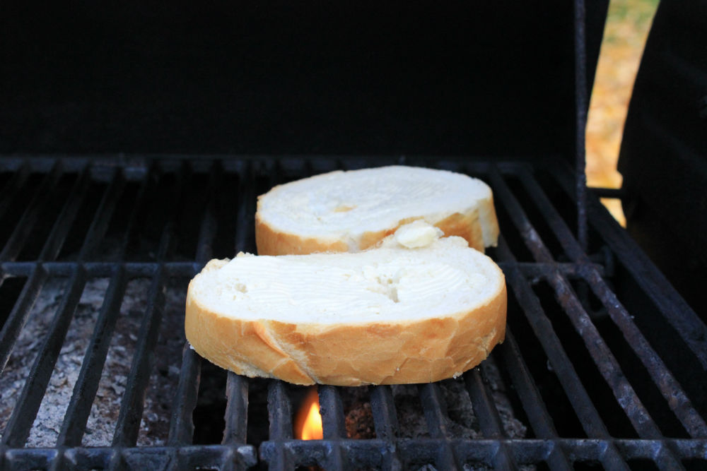 - Turn grill down and put bread on grill to toast. Check frequently and flip over when first side is toasted.