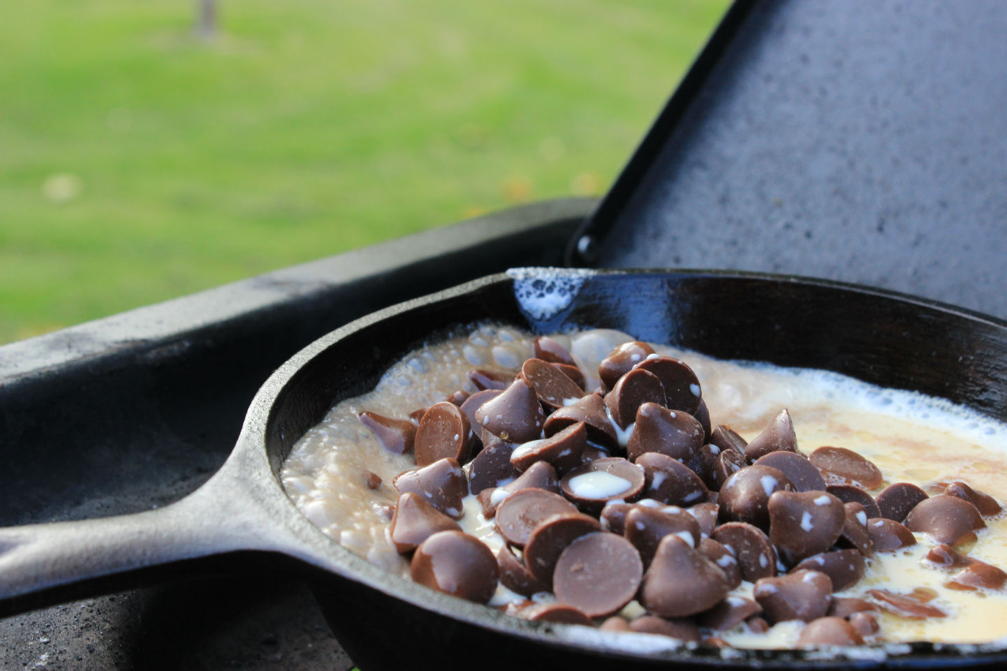 While the first layer was cooking, I got the chocolate caramel sauce going. I added the chocolate caramel chips with some more evaporated milk to my small cast iron pan and started to heat it over medium heat. I started this on my side burner, but moved it to my grill after it got going. I heated it, stirring regularly, until the chocolate sauce was smooth and creamy. I had to try it and it tasted amazing!