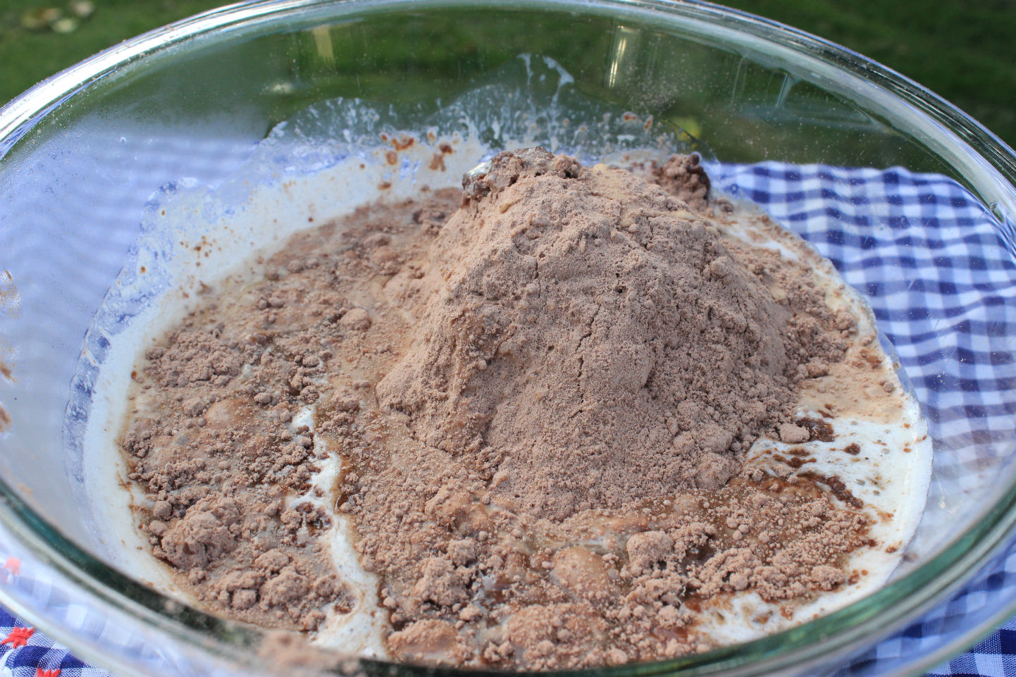 After I got that mixed and the Dutch oven heated, I put half the batter into the Dutch oven. This was the first layer. There were two more layers to go: a gooey chocolate caramel sauce layer and then another chocolate cake layer. It will be delicious!