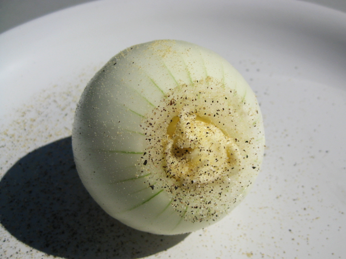 Start with an onion that has the outer skin removed and then scoop out the middle with a small spoon.