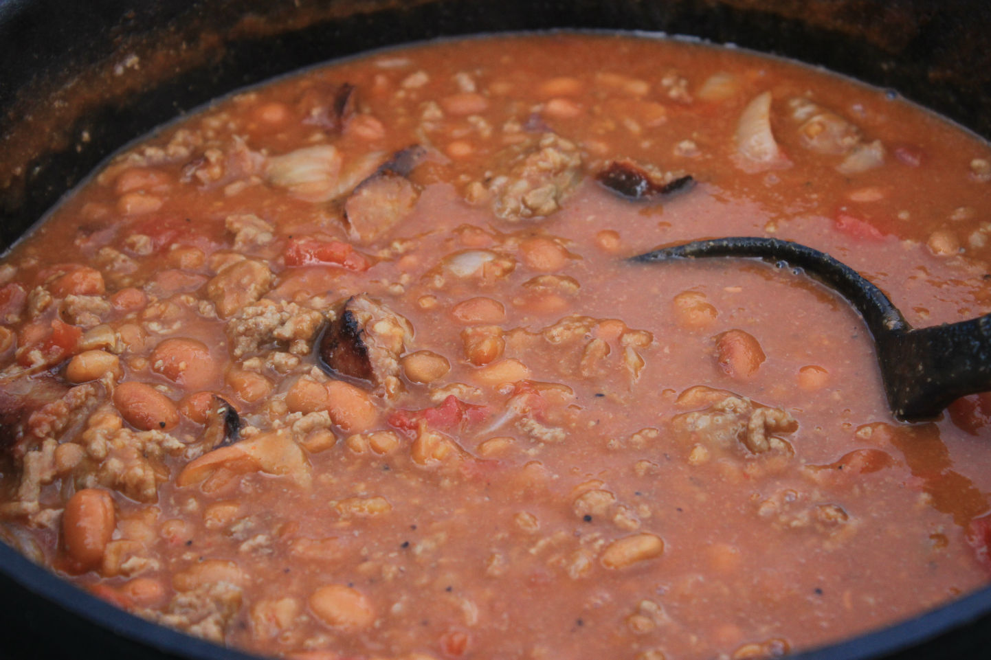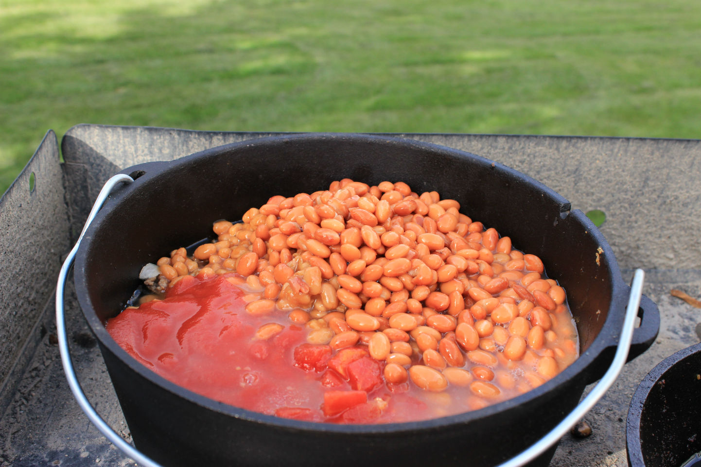 Simmer in Dutch oven with lid on and 9 coals on top and 15 on bottom. Simmer until all is warm through.