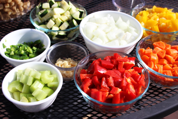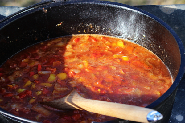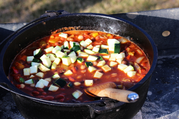 Recipes like this are fabulous for the Dutch oven, because of all the liquid, they are easy to do and are almost a set and forget. Other than putting the zucchini in towards the end, you can pretty much dump everything in, get it up to a boil, then let is slow simmer until all the veggies are done. Pretty easy for an outdoor dish.