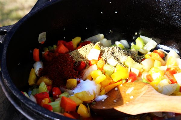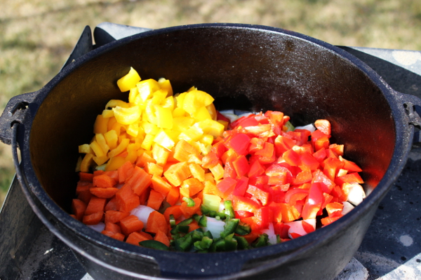 I started a Dutch oven warming up with coals underneath, then dumped the veggies in and cooked a few minutes until they started to turn a darker color.